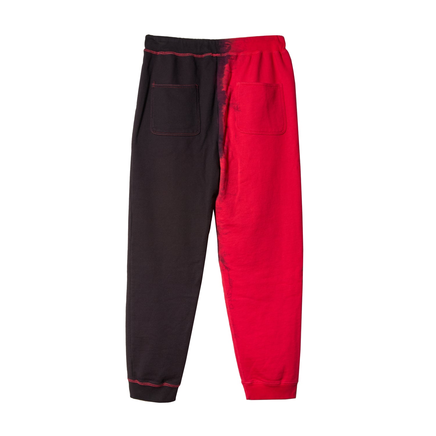 絞り染め加工で半身を黒く染めたスウエットパンツ。
