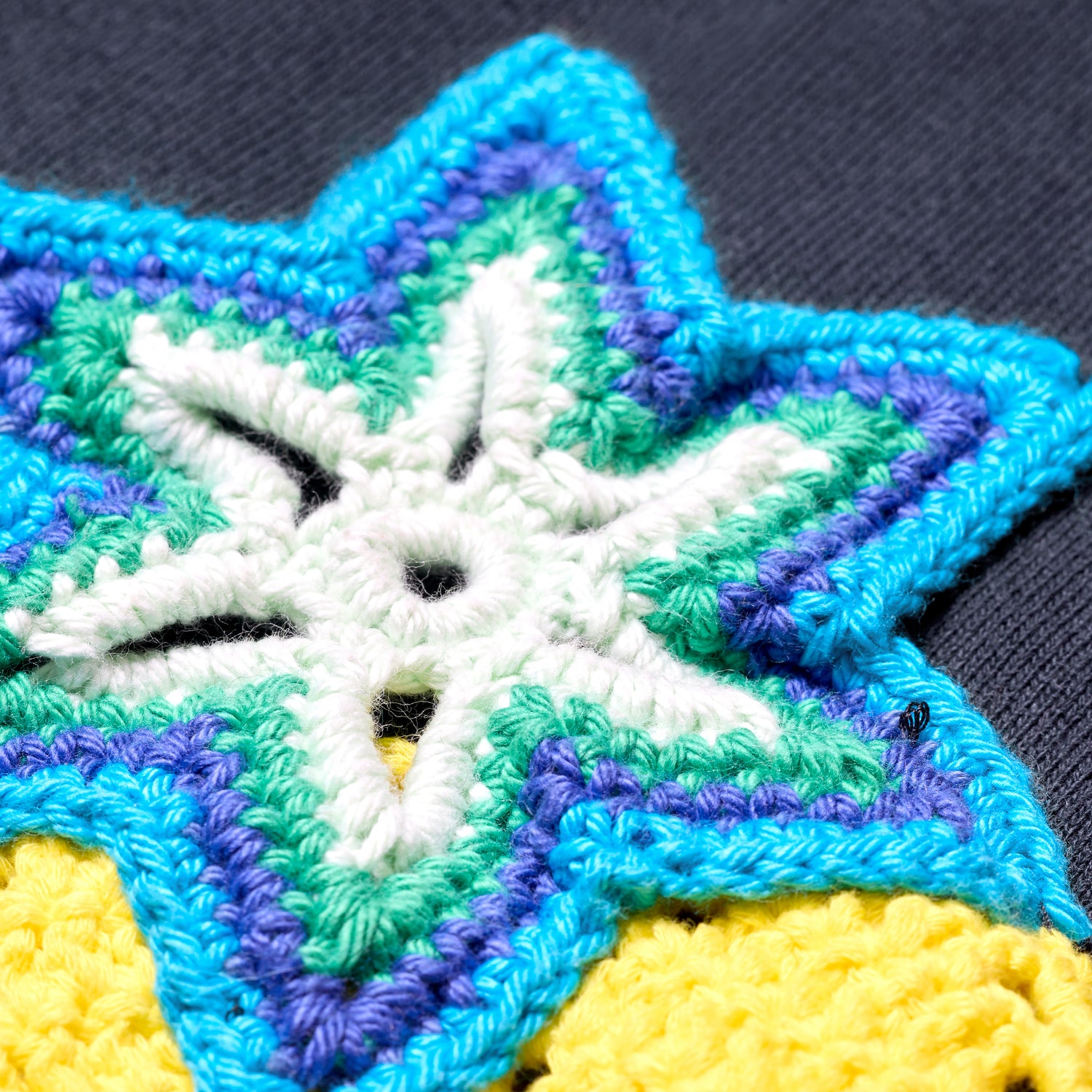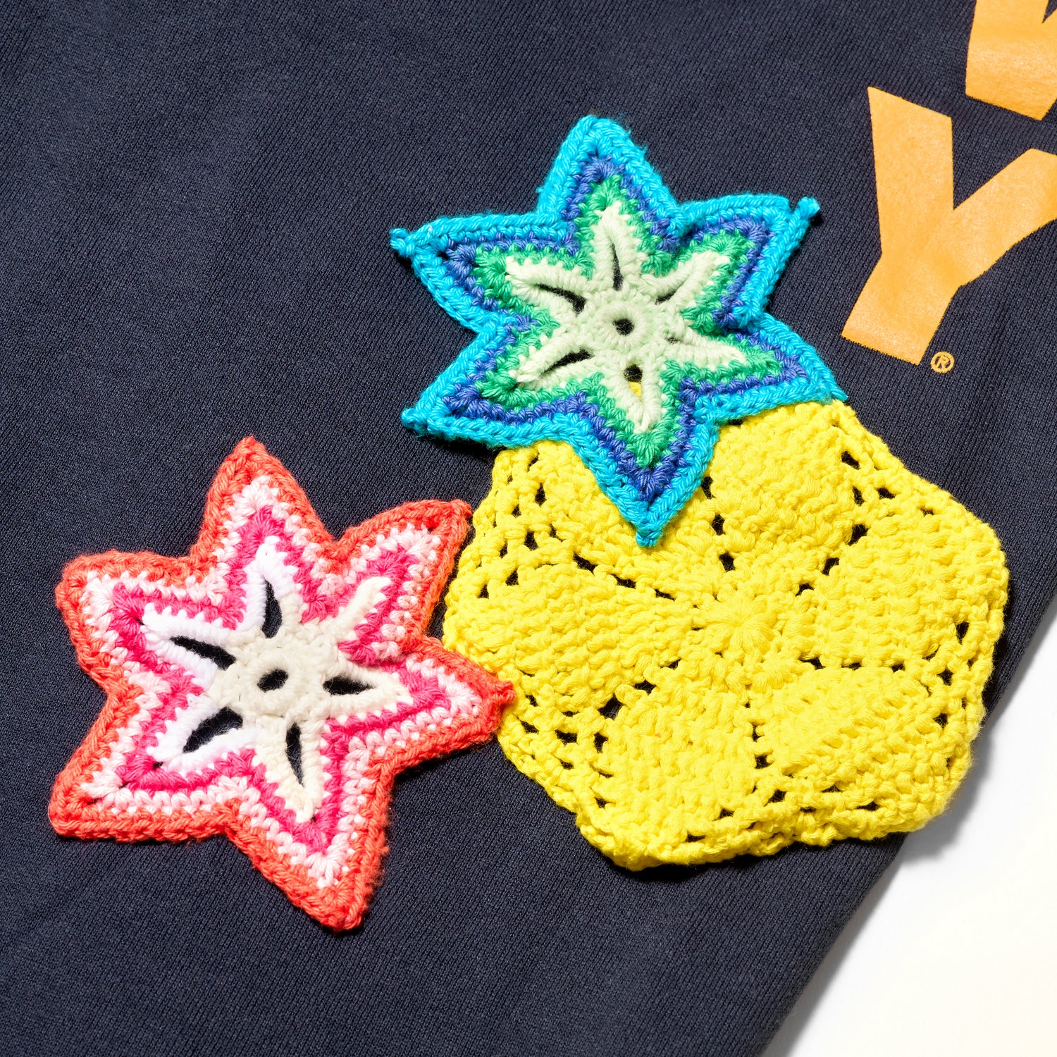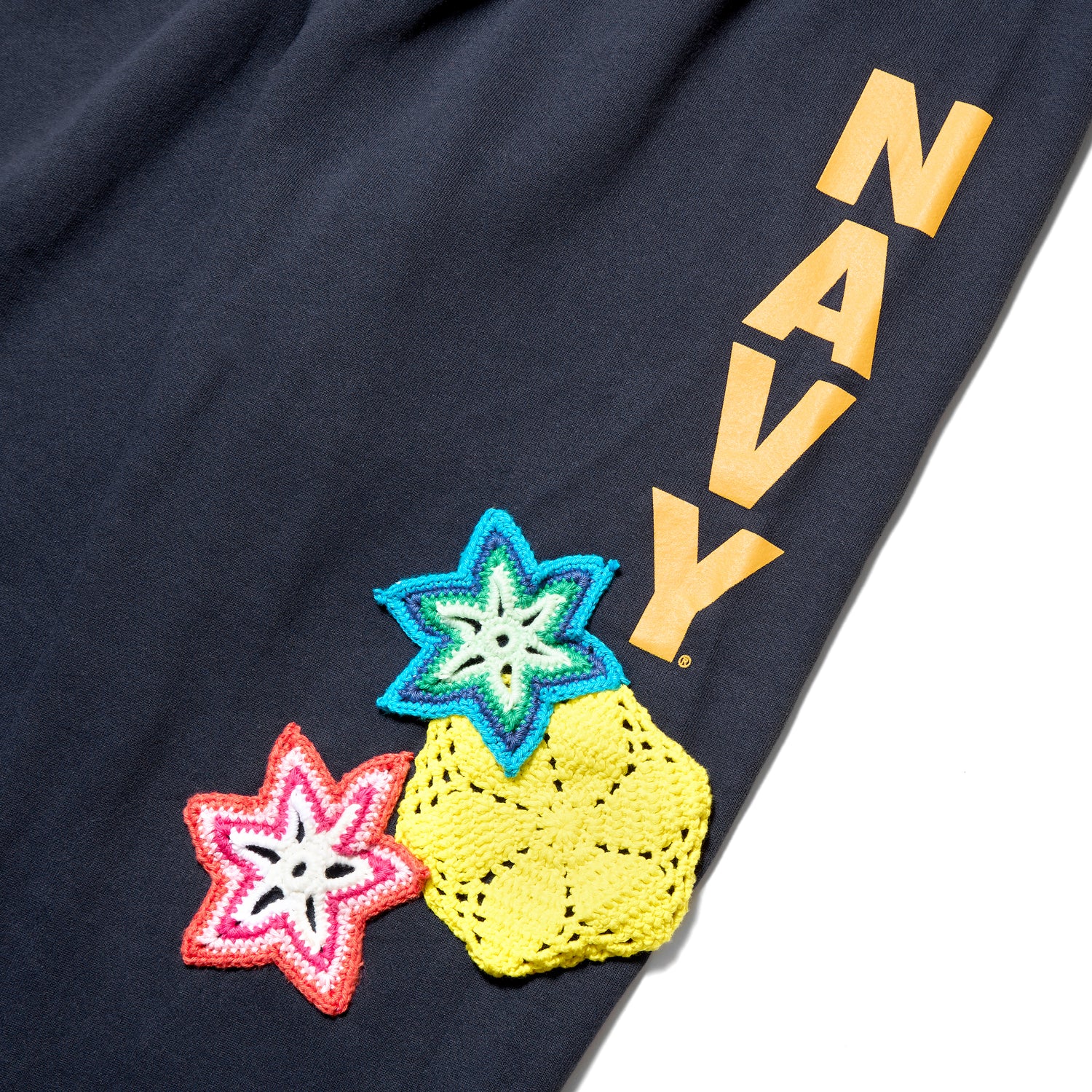 古着のARMY SWEAT PANTSにクロシェモチーフをつけました。